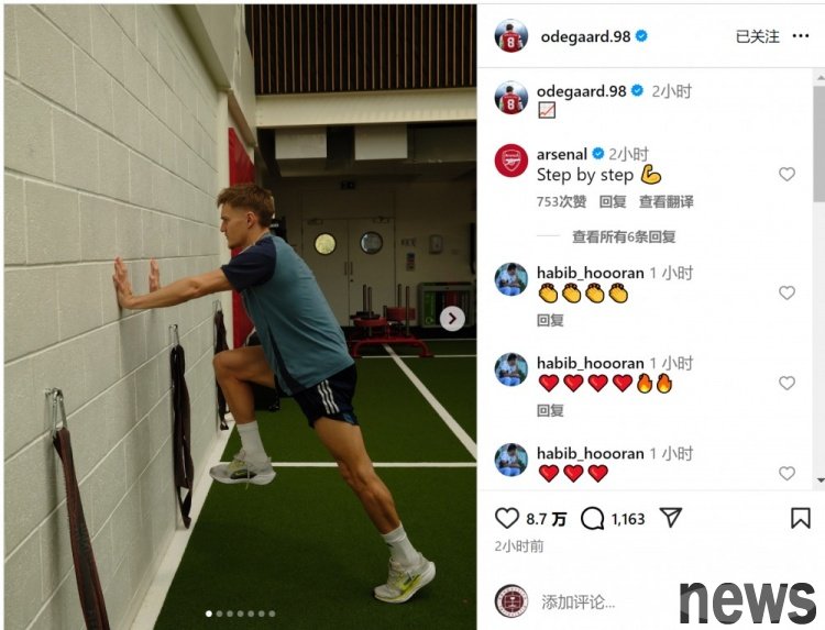 Odegaard injured the medial collateral ligament of his knee in the game against West Ham on October 4. He posted photos of rehabilitation training on social media. The Arsenal midfielder is working hard to recover and hopes to return as soon as possible to help the team.